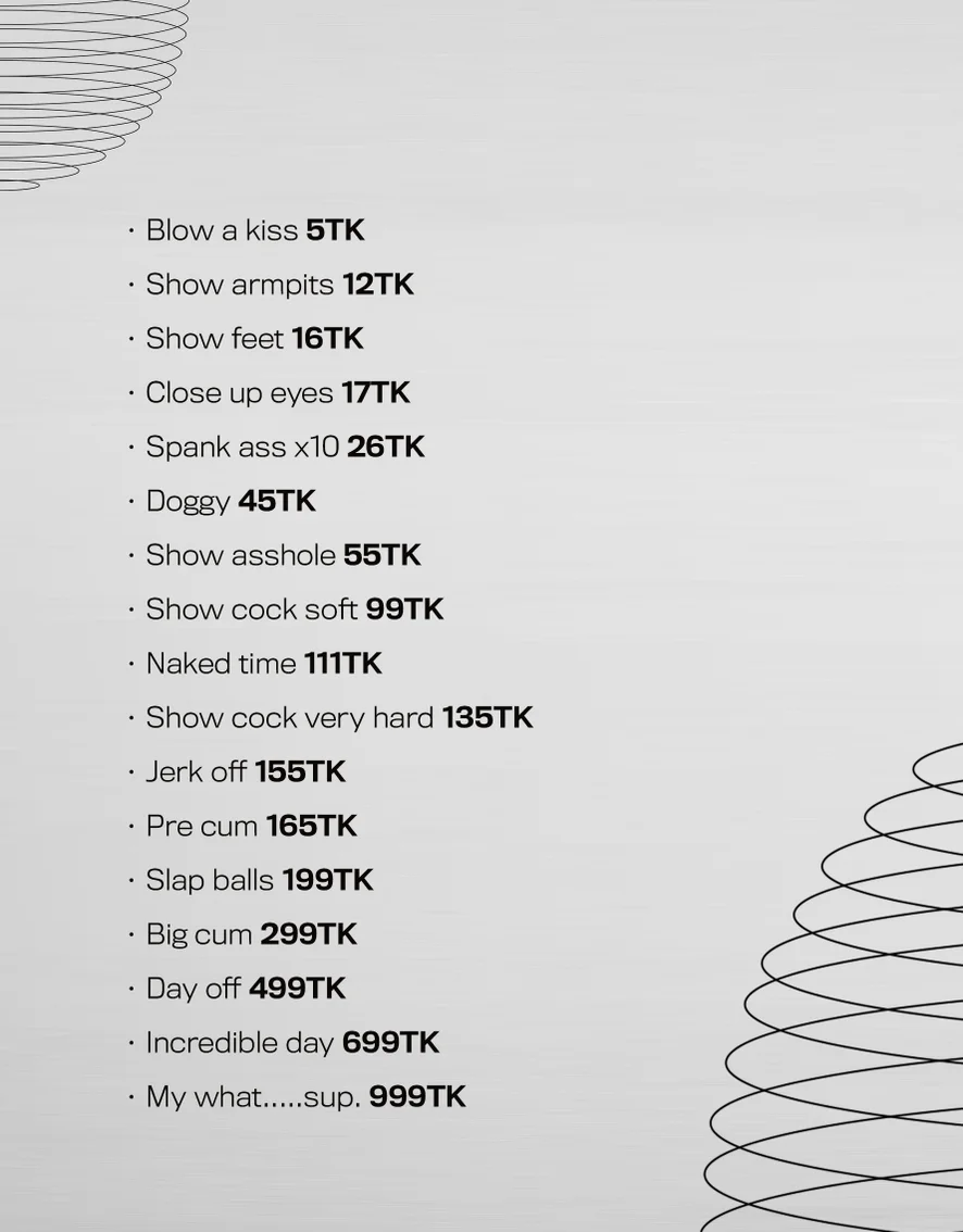 Шлепки, Эротические танцы, Мастурбация пальцами, Грязные разговоры, Стриптиз, Фут-фетиш, Кольцо на член, Раком, Инструкция по глотанию спермы, Эякуляция, Унижение, Мастурбация, Шоу с маслом, Дилдо или вибратор, Показывают мышцы, Инструкция по дрочке, Анальные игрушки, Кляп, Дрочка рукой, Унижение маленького пениса